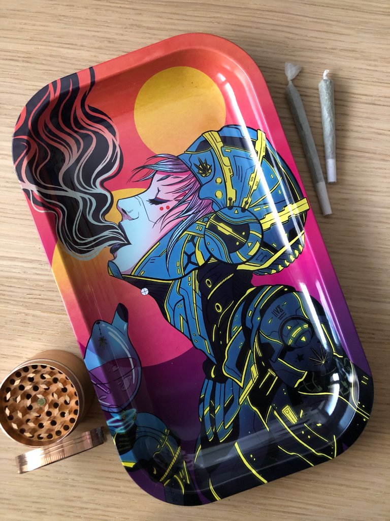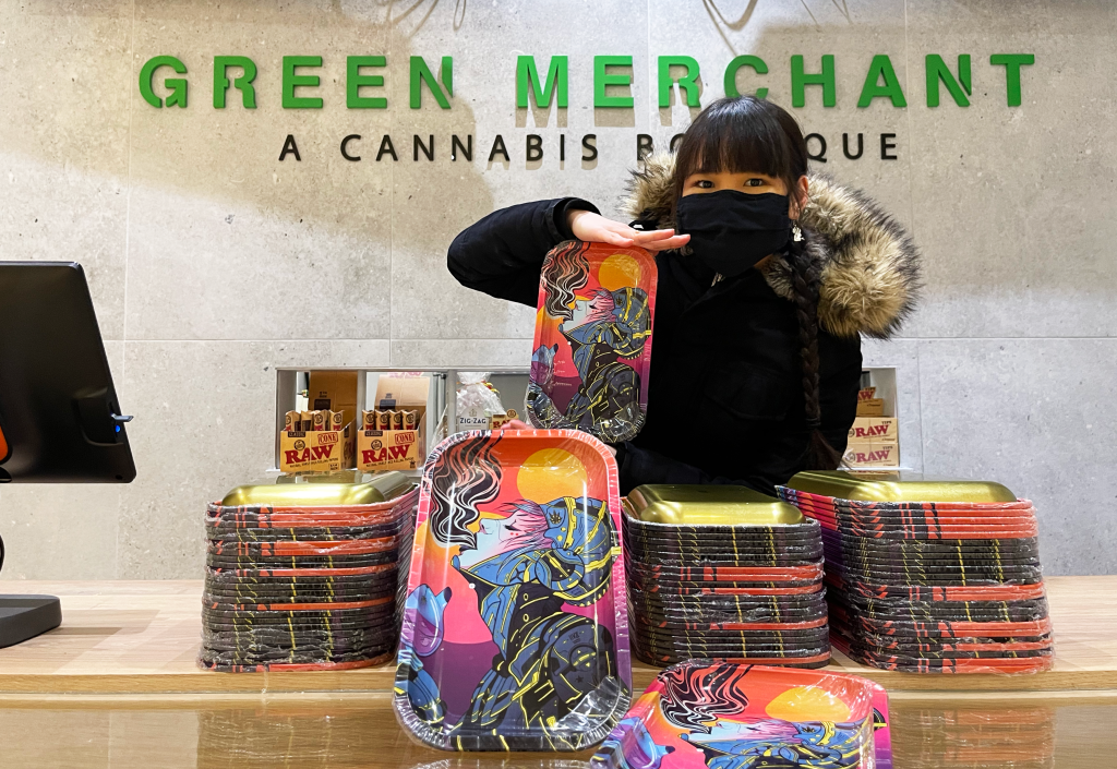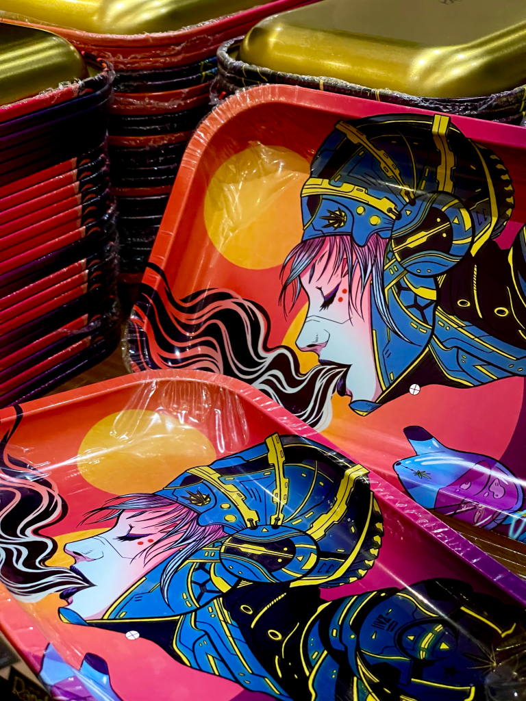 Signed limited edition rolling trays with Green Merchant Cannabis Boutique. Released on January 2021 and is available for purchase here.
